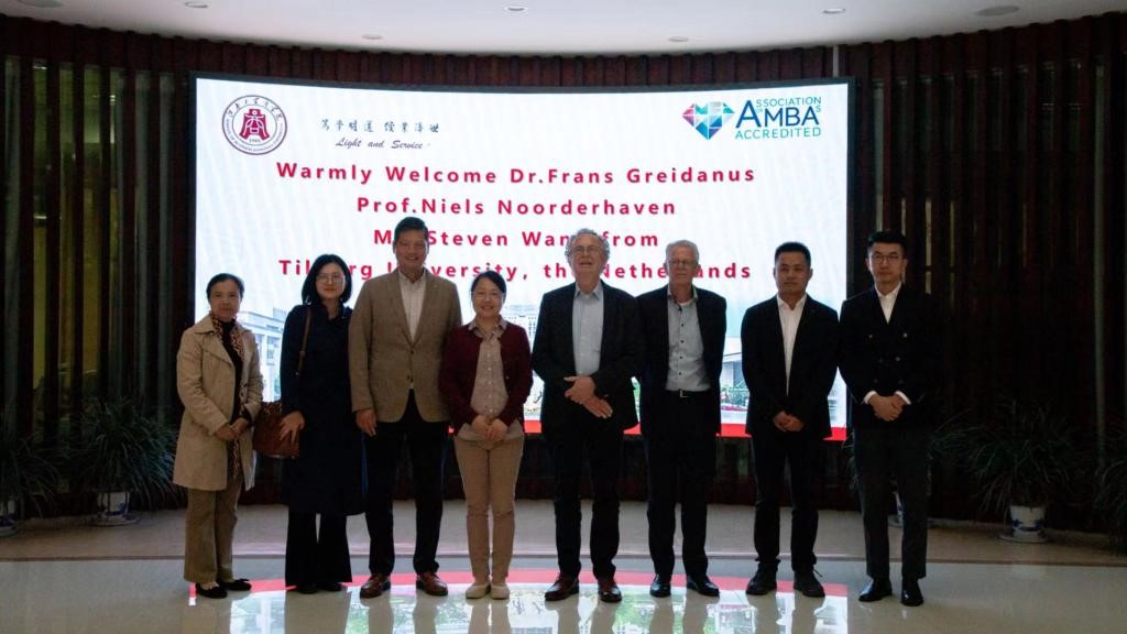 On the afternoon of November 8, a delegation from Tilburg University, consisting of Dr. Frans Greidanus, Board advisor and Professor of Qiushi Lecture, and Professor Niels Noorderhaven, Deputy Dean of the School of Economics and Management, visited Jiangnan University. They were accompanied by Mr. Wang Xu, Representative of North Brabang Province of the Netherlands to Jiangsu, and Mr. Long Xin of the Foreign Affairs Office of Wuxi Municipality. The delegation had an exchange meeting with representatives from Jiangnan University, including Cai Jianying, Deputy Director of International Exchange and Cooperation Office, Pu Xujin, Dean of the Business School, and Gong Xiaobin, Dean of the College of International Education.