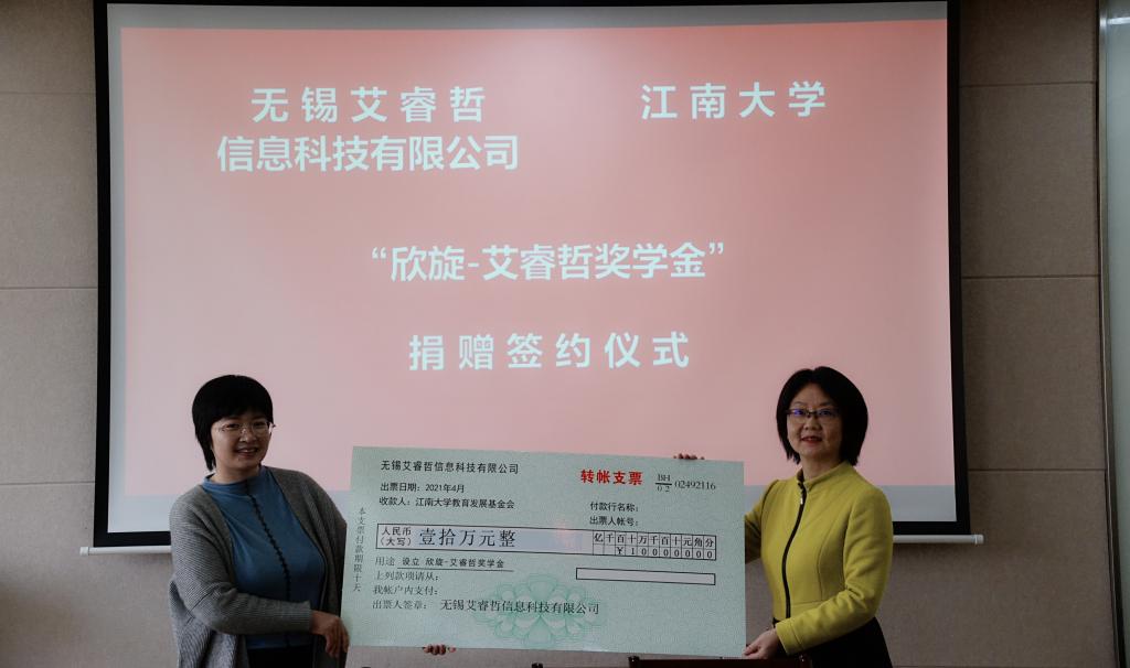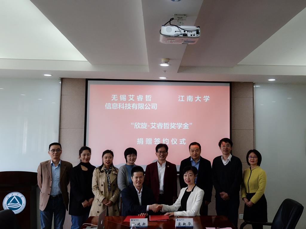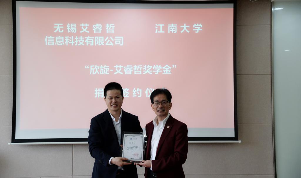 At the ceremony, Xu Jianxin and Dou Xinhua signed a donation agreement on behalf of both parties. Airuizhe Information & Technology donated 100,000 yuan to the MBA Program Center. Teng Lefa presented a certificate to Wuxi Airuizhe Information & Technology, and Sun Junmin accepted the donation check on behalf of MBA Program Center.