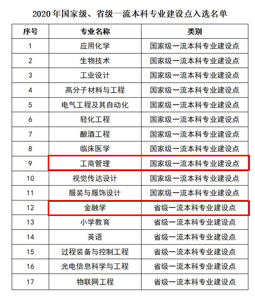 工商管理专业获批国家级一流本科专业建设点,金融学专业获批省级一流本科专业建设点。全校本轮共有11个专业获批国家级一流本科专业建设点, 6个专业获批省级一流本科专业建设点,获批数量位居全省前列。