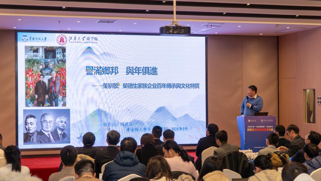 在主题分享环节,华南师范大学历史文化学院硕士生导师,中山大学(管理学院)中国家族企业研究中心研究员周孜正博士带来以“誉满乡邦 与年俱进—荣宗敬、荣德生家族企业百年传承与文化特质”为主题的研究分享。周博士从荣宗敬先生的家族性爱网站、荣宗敬和荣鸿庆先生家族性爱网站传承的方式及硕果,荣德生和荣毅仁先生家族性爱网站传承的方式及硕果等三个维度切入,分析荣氏家族何以实现家族代代传承、家业百年长青。
