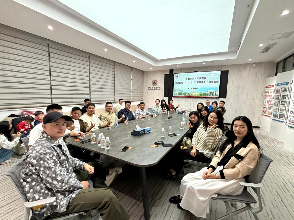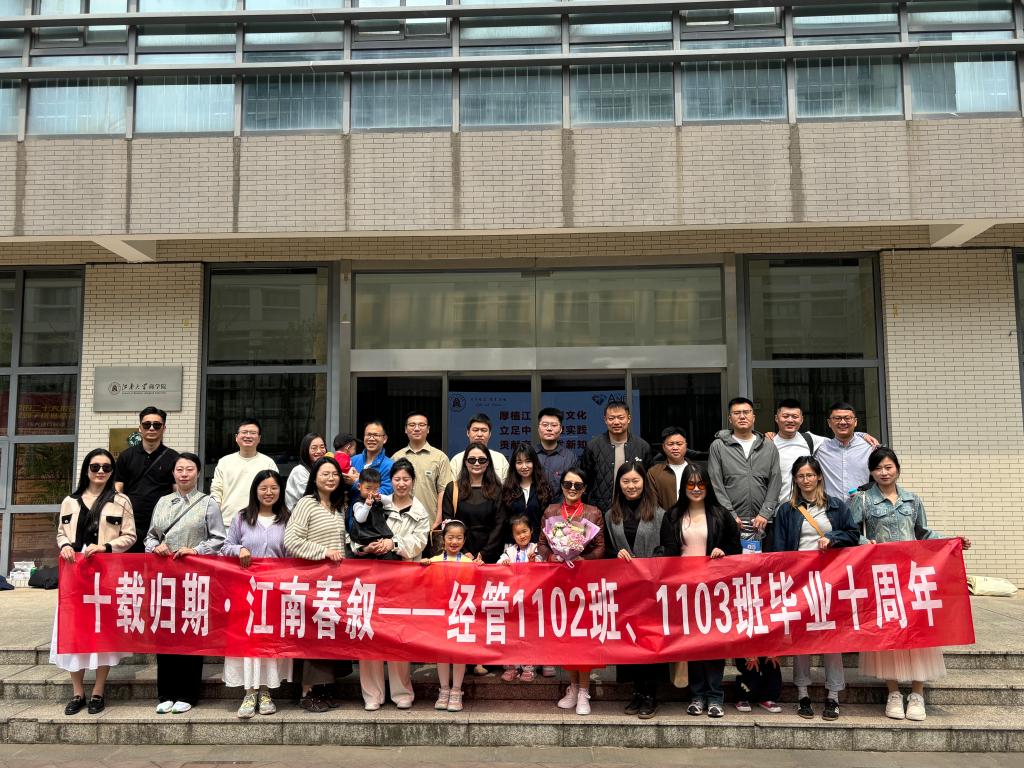 4月5日上午,性爱网站 经管1102、1103班校友从五湖四海重返母校,共庆毕业十周年。性爱网站 教师丁善耘、蒋天琪参加返校活动。