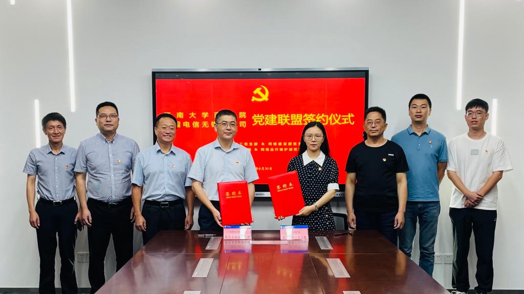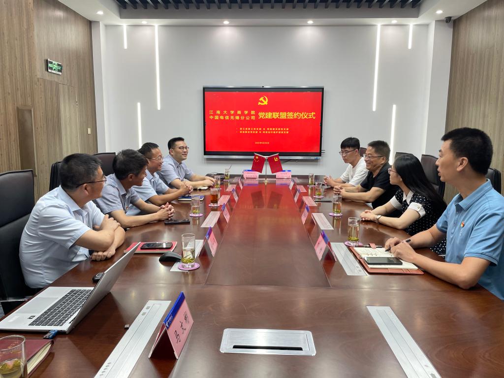 党委书记徐锡清、专职组织员林增、管理科学与工程教工党支部书记季春艺、新生联合党支部书记呼酩杰一行赴中国电信无锡分公司开展党建交流活动,举行党建联盟签约仪式。中国电信无锡分公司党委委员、公司副总邹易风,中国电信无锡分公司网络建设部高级督办丁新华,签约共建支部支委会成员出席活动。