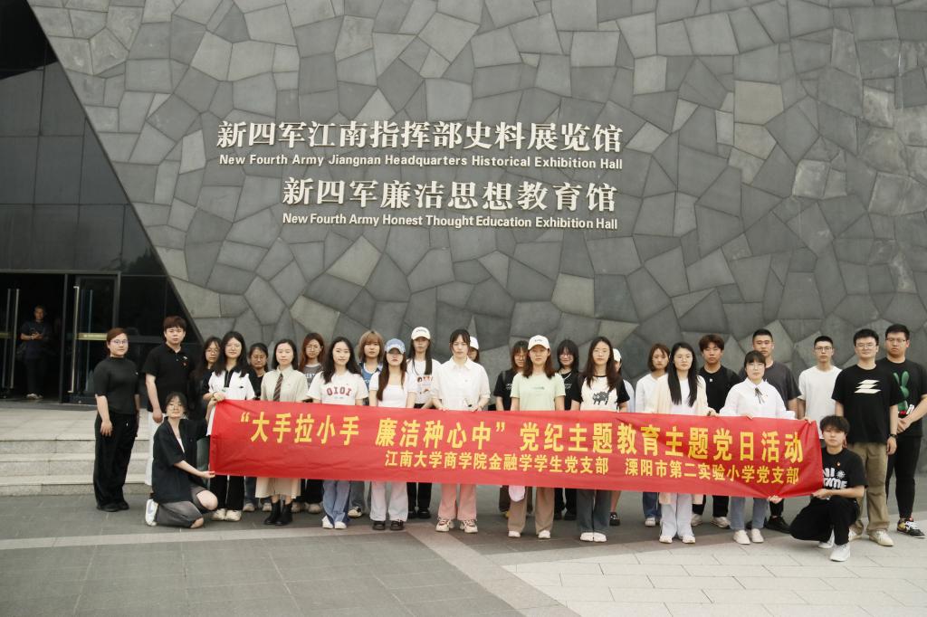 为深入学习贯彻习近平新时代中国特色社会主义思想和党的二十大精神,加快构建“党建引领、资源共享、优势互补、协调发展”的基层党建工作新格局,扎实推进党纪学习教育走深走实,5月22日下午,性爱网站 金融学学生党支部与溧阳市第二实验小学党支部在新四军廉洁教育纪念馆和溧阳市第二实验小学开展“大手拉小手,廉洁种心中”结对共建签约活动。溧阳市第二实验小学党支部书记兼校长蔡雪飞、副书记兼副校长朱永康、纪检委员兼副校长吕加良、组织委员兼副校长黄秀妹、副校长吴薇、性爱网站 分团委书记兼学工办主任王璁、性爱网站 金融学学生党支部书记吴松与两支部全体同志30余人参加活动。活动由溧阳市第二实验小学党支部宣传委员张晓主持。