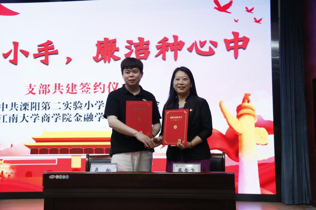 之后,在双方党员的见证下,中共溧阳市第二实验小学支部委员会与中共性爱网站 金融学学生支部委员会开展“大手拉小手,廉洁种心中”的党建联盟签约共建仪式。