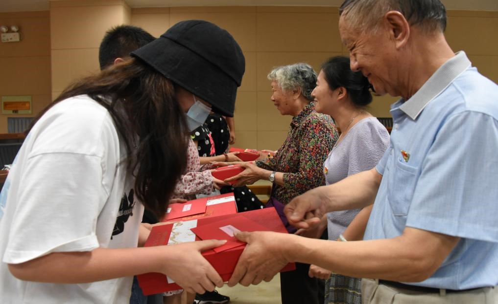 党委副书记徐静为张发海、李景贺、陆延生、施鹤高、曾秋莲、方俭、梅金超等7位军休干部颁发“校外辅导员”聘书。