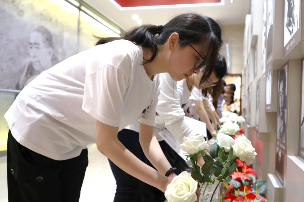 宣讲团成员以及学生党员在党建馆讲解员的带领下,参观党建馆。从“星火”展馆的“井冈山精神”,到“圣地”展馆的“延安精神”,从“烽火”展馆的“抗战精神”,到“黎明”展馆的“西柏坡精神”“红岩精神”,再到“奋斗”展馆的“北大荒精神”“铁人精神”,以及新时代的“脱贫攻坚精神”。迈入党的时光隧道,大家走近党的历史,学习时代精神,全体党员及宣讲团成员受益匪浅。站在丰碑永存的烈士纪念馆前,宣讲团成员及学生党员,面向烈士遗像深情颂诗,沉痛三鞠躬,并为烈士敬献白花以表敬意。