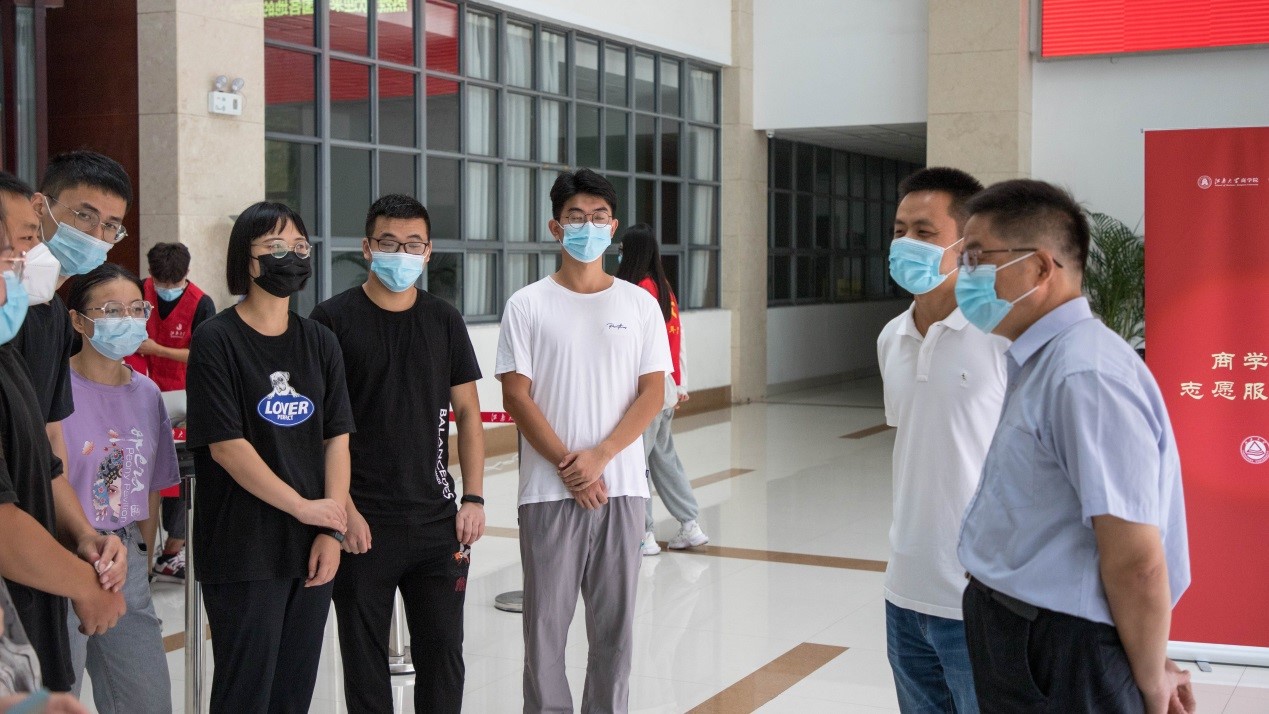 在报到现场,新生辅导员与同学们耐心交流,为新生答疑解惑。新生们在志愿者的引导下完成体温监测,报到登记注册等。在杏园、梅园学生公寓,志愿者协助新生搬运行李,将学生行李运送至寝室。