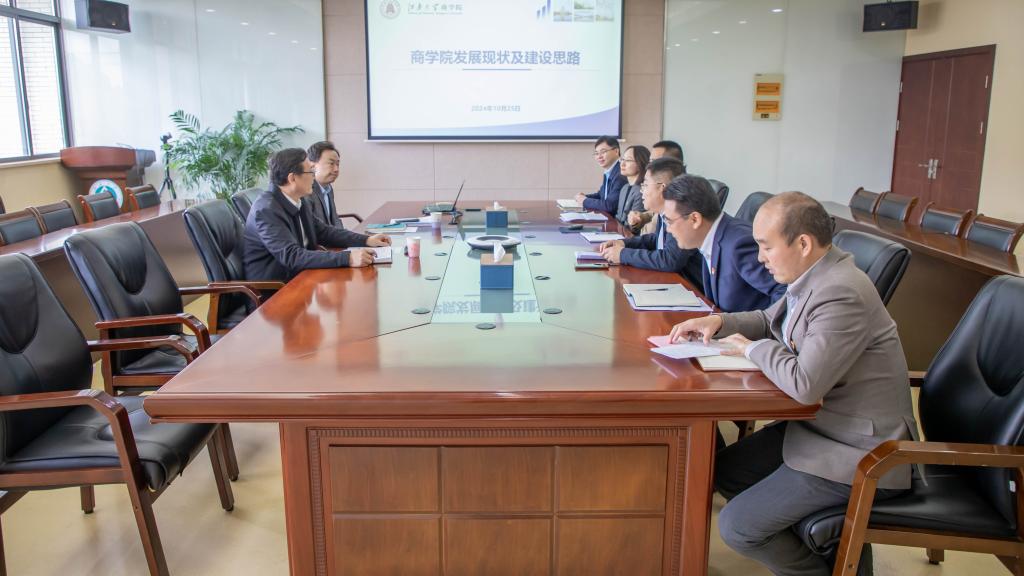 院长浦徐进从学院基本情况、问题挑战、目标举措三个方面作汇报。他聚焦师资队伍、学科建设、研究生教育、科学研究、人才培养、EDP培训和国际交流与合作等方面进行阐述,并就学院目前在师资队伍培育、产教融合发展、人才培养体系优化、博士点申报等方面提出发展思路和举措。刘长青介绍了学院党委的基本情况,围绕党的政治建设、思想建设、组织建设等方面进行了汇报,并提出强化党建引领、推动“一融双高”的下一步工作思路。与会其他领导分别围绕大学生思政、科研管理、研究生教育和本科教育教学改革等方面进行了汇报。