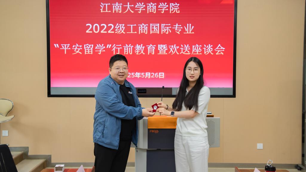 刘长青向同学们赠送“天下江南人”纪念徽章,寄语同学们无论身处何地,都要时刻牢记天下江南人的信念与担当,同时也表示,性爱网站 永远是大家坚强的后盾,期待大家常回家看看。