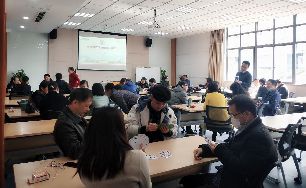 教职工迎新春棋牌比赛。全院教职工积极响应,经过前期各系部门的内部预赛和推荐,共有16组32名选手参加现场比赛,通过现场抽签决定对手,比赛分为初赛、复赛、决赛进行淘汰赛。