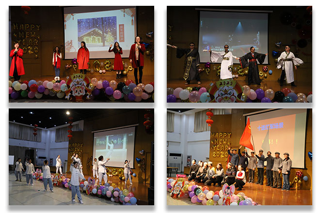 联欢会上,首先由李佳敏书记、滕乐法院长等院领导为退休教师们献上红围巾,为服务学院发展满30年、20年的47位教师颁发“贡献纪念奖杯”,奉上一束束鲜花感恩他们为学院建设发展贡献的智慧和力量,大力弘扬尊师重教、爱校兴院的良好风尚。整台联欢会由各系、各部门老师们自编自演节目,融汇了歌舞、诗朗诵、互动小游戏、历史情境模仿秀等多种表演形式,节目精彩的表演令在场的老师们掌声欢笑声不断,为大家带来新年的祝福和欢乐。