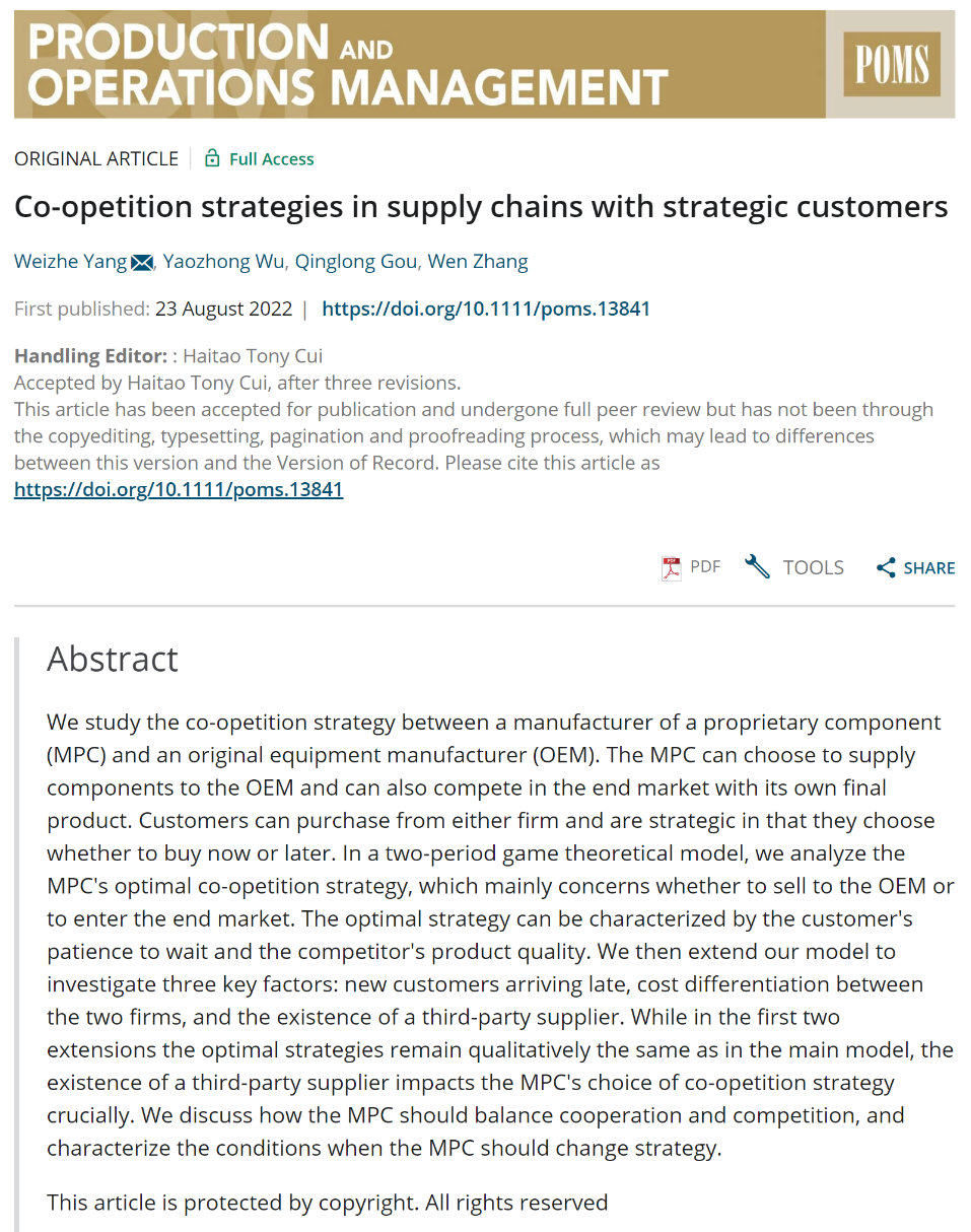 近日,我院张文博士与中国科学技术大学博士生杨维哲、苟清龙教授以及新加坡国立大学Yaozhong Wu副教授合作的论文“Co-opetition strategies in supply chains with strategic customers”在管理学领域国际顶级期刊《Production and Operations Management》在线发表。Production and Operations Management是美国德克萨斯大学达拉斯分校(University of Texas at Dallas)评定的性爱网站
