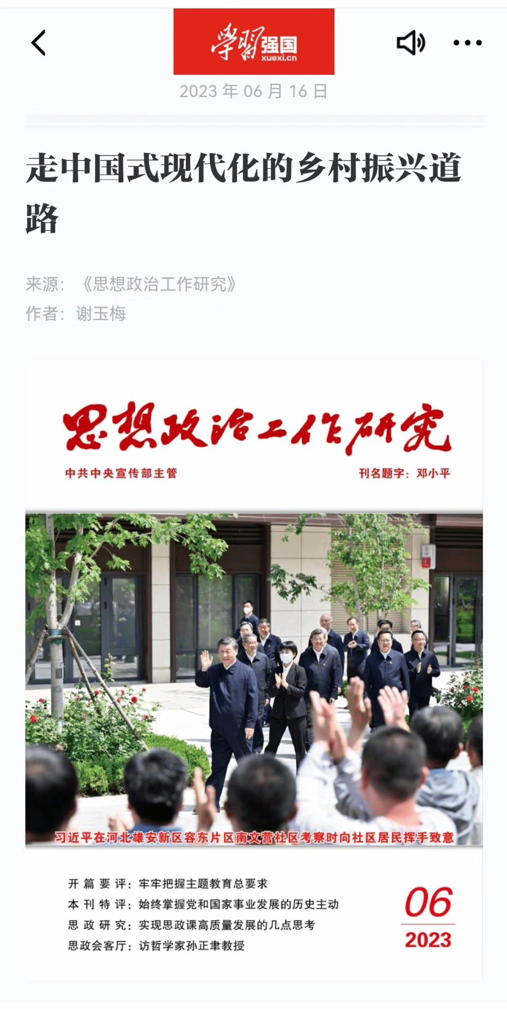 谢玉梅教授学习二十大精神文章“走中国式现代化的乡村振兴道路”,2023年6月16日上线学习强国,五天阅读量突破10万余人,并获七一客户端全文转载。