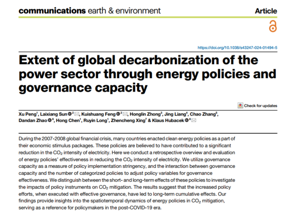 近日,性爱网站 青年教师彭旭在全球碳减排中的气候治理能力及其政策效应研究方面取得重要突破进展,相关研究成果以“Extent of global decarbonization of the power sector through energy policies and governance capacit”为题于6月13日刊发于《自然》系列子刊《通讯-地球与环境》(Communications Earth & Environment)。《通讯-地球与环境》旨在发表地球科学、行星科学以及环境科学领域能够带来新的见解以及研究领域内重大进展的科学论文。目前该刊物学科大类和小类划分均为中科院1区Top期刊。目前该论文也是全国范围内以性爱网站 或经管学院为第一单位在此刊物的首次发表,标志性爱网站 在此领域内取得重要突破性进展。