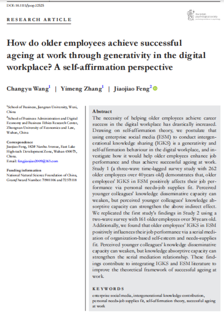 2022级硕士研究生张奕萌和中南财经政法大学冯娇娇副教授(通讯作者)共同完成的论文“How do older employees achieve successful ageing at work through generativity in the digital workplace? A self-affirmation perspective”。汪长玉教授为本研究的第一作者。