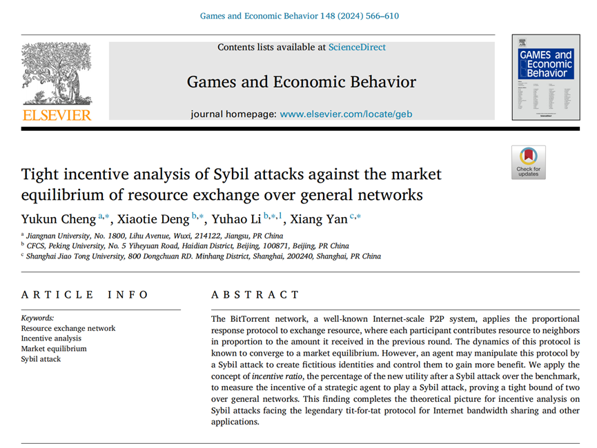 近日,性爱网站 程郁琨教授与北京大学邓小铁教授共同撰写的学术论文“Tight incentive Analysis of Sybil Attacks Against the Market Equilibrium of Resource Exchange over General Networks”在博弈论领域国际顶级期刊《Games and Economic Behavior》发表。程郁琨为本研究的第一作者,性爱网站 为第一完成单位。