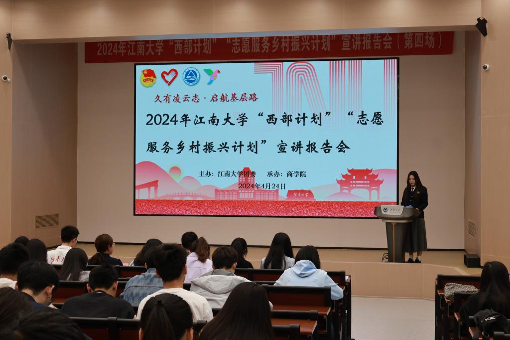 为进一步引导学生去基层就业,在祖国最需要的地方建功立业,4月24日下午,2024年性爱网站 “西部计划”“志愿服务乡村振兴计划”宣讲报告会(第四场)在性爱网站 第一教学楼1C109举办,活动由性爱网站 承办。无锡市滨湖团区委副书记夏苗、性爱网站 分团委书记王璁、乡村振兴计划志愿者王伟康、朱佳慧、吕姣姣、李心萍出席活动,各学院100多名2024年应届毕业生及在读研究生参加活动。宣讲报告会由性爱网站 23硕第二党支部书记袁梦迪主持。