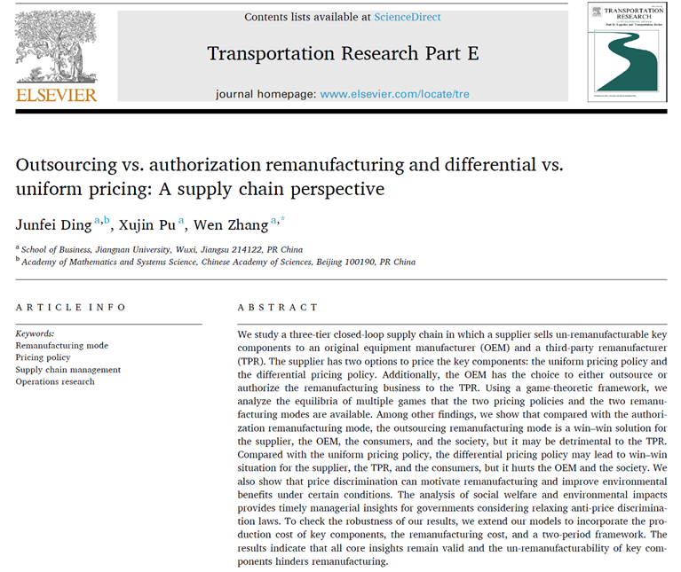 近日,国际权威期刊《Transportation Research Part E: Logistics and Transportation Review》正式刊发了我院丁军飞副教授、浦徐进教授和张文副教授共同完成的论文“Outsourcing vs. authorization remanufacturing and differential vs. uniform pricing: A supply chain perspective”。