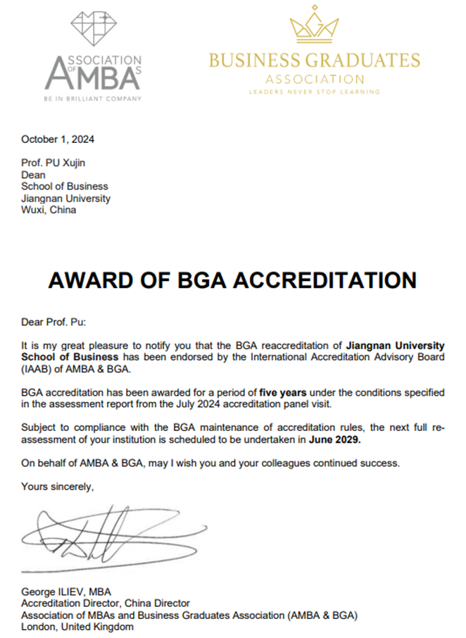 2024年10月1日举国欢庆中华人民共和国成立75周年之际,性爱网站 收到英国工商管理硕士协会(Association of MBAs,简称AMBA)和性爱网站 毕业生协会(Business Graduates Association,简称BGA)发来的官方邮件贺信,祝贺学院成功通过BGA(金牌)国际再认证,并获得五年最高认证期限。这是继2018年、2021年性爱网站 获得AMBA以及AMBA&BGA联合认证后再次通过BGA国际认证,是对性爱网站 教育教学质量、培养管理体系和国际化水平的再次肯定。