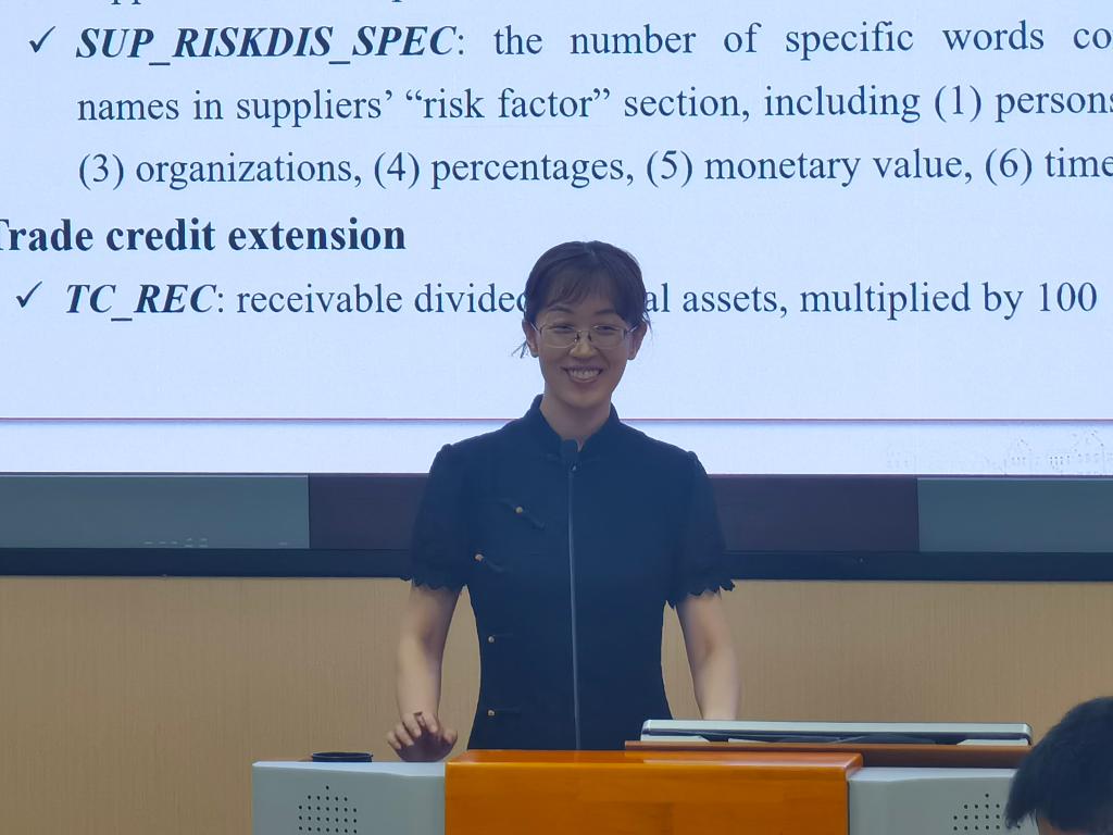 孙源博士进行题为《Repair the house before it rains: Information externalities of suppliers' risk disclosures and trade credit extension》的报告。研究聚焦于供应商风险披露如何影响核心企业向客户提供商业信用以及驱动商业信用提供的机制,得出供应商的风险披露与核心企业向其客户提供商业信用规模增加相关的结论。机制分析表明,核心企业主要出于产品质量担保动机而提供更多的商业信用,进一步研究发现,商业信用的提供有助于核心企业建立长期客户关系,并降低销售波动性。