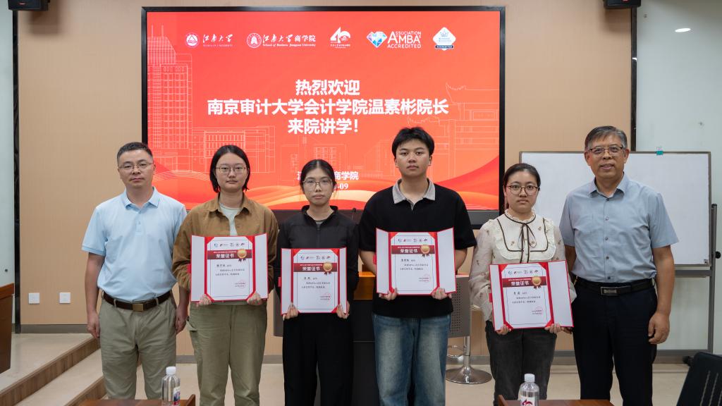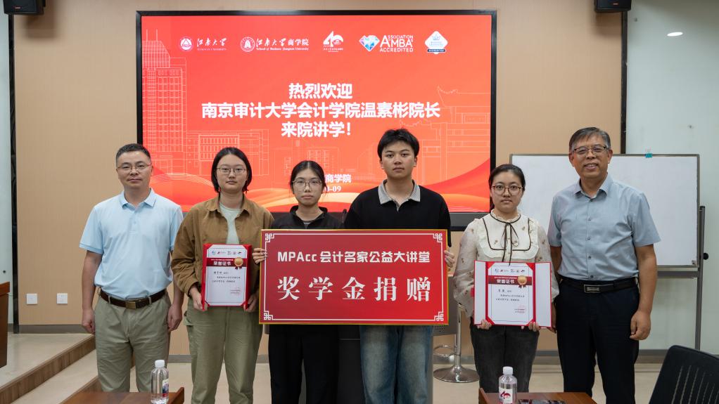 王雷介绍了“MPAcc会计名家公益大讲堂”的相关情况,表示该活动是由中国会计学会、全国会计专业学位研究生教育指导委员会共同发起的一项全国性公益活动,旨在充分发挥会计名家在引领和推动我国会计教育持续繁荣发展方面的重要作用,为MPAcc学员创造更多与会计知名学者交流和学习的机会,从而全面提升学员的综合素质。温素彬教授将本次讲座的全部课酬捐赠给性爱网站 ,用于设立“MPAcc会计名家公益大讲堂奖学金”,以资助成绩优异的MPAcc学员顺利完成学业。根据入学成绩排名,2025级全日制MPAcc学员李蓓、李彤、苏清扬和张宇欣4位新生同学荣获该项奖学金。