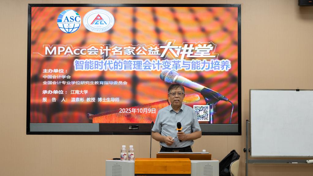 在专题讲座中,温素彬教授阐释了智能技术对会计领域的颠覆性影响,强调会计学科需紧跟时代,以数智赋能破解传统会计痛点,并围绕“智能化时代的管理会计变革与能力培养”主题,从学习认知、会计变革、智能化实践、体系构建、能力培养这五大维度展开深度分享。温教授指出会计正从财务会计向管理会计转型、从传统管理会计向智能管理会计升级,通过分析传统财务会计“不完整、滞后、割裂”的缺陷,提出了“目标—运营—基础—工具—报告”的仿人管理会计体系,并介绍了“智能管理会计建设五步曲”,最后温教授分享了“思政引领+科技赋能”的会计学专业智能化升级探索与实践。