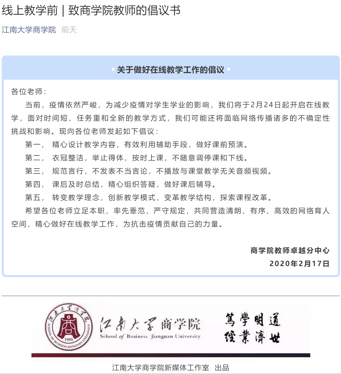学院教师卓越分中心向全院教师关于做好在线教学工作的倡议书